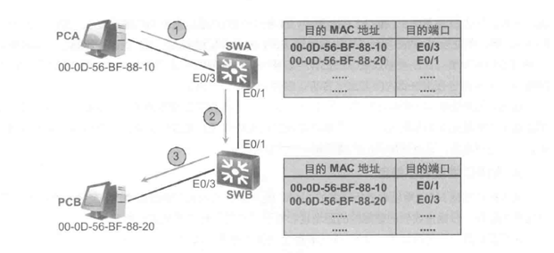 交换机基于MAC地址表进行转发,MAC地址表说明了目的MAC地址和目的端口的对应关系。如图所示,假设PCA向PCB发送一个数据帧,此数据帧的目的MAC地址设置为PCB的MAC地址00-OD-56-BF-88-20。交换机会执行以下动作。