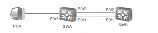 如图所示:交换机SWA 的 E0/1和SWB 的 E0/1 相连,SWA的 E0/2和SWB 的 E0/2 相连。