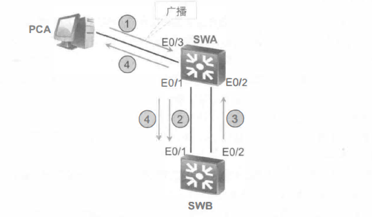 假设SWA从E0/3 接口接收到一个广播帧.根据交换机的转发原则,应该向除 E0/3 外的所有端口转发该广播帧,包括E0/1和E0/2接口(在本例中,只考虑从E0/2接口发出的广播报文)。当该广播帧从SWA的E0/2转发到交换机SWB 后,SWB会通过E0/1向SWA继续转发该广播帧。这样该广播帧就会沿着SWA-E0/2-SWB-E0/2-SWB-E0/1-SWA-E0/1-SWA-E0/2…无限转发下去。反方向SWA-E0/1- SWB-E0/1-SWB-E0/2-SWA-E0/2 -SWA-E0/1…也是一样的。