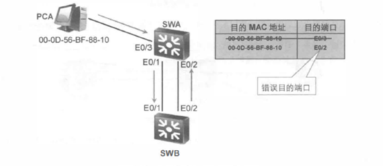 因此,二层环路造成了MAC地址表不稳定,在重复的学习中还会导致错误的MAC地址表项,如上图所示。在某些时候,MAC地址表中 00-00-56-BF-88-10对应的接口会是 E0/1或者 E0/2。