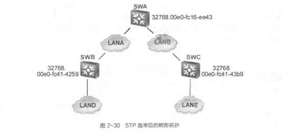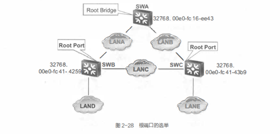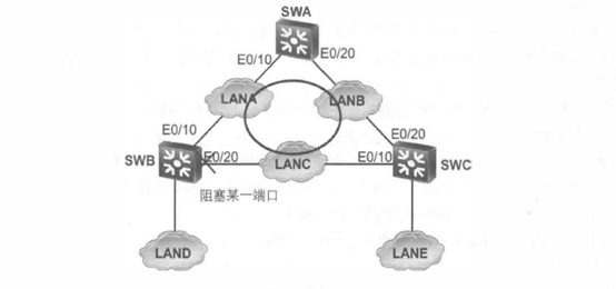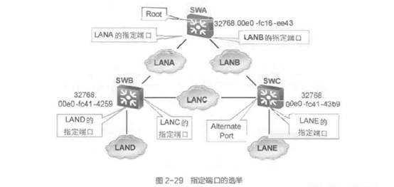对于根交换机来说,所有端口都是所连接网段的指定端口。因此LANA和LANB的指定端口都在SWA上。LAND和LANE都只连接了一个交换机端口,此端口即为指定端口。