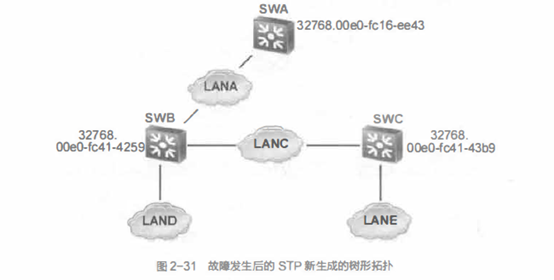 对于LANC来说,同时连接到两个交换机端口,并且两个交换机的根路径开销相同,因此需要比较两个端口所在交换机的交换机标识。由于SWB的交换机标识比SWC小( MAC地址更小),因此LANC的指定端口在SWB上。