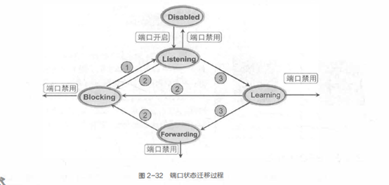 如果经过计算,端口角色需要设置为根端口(Root Port)或指定端口( Designated Port),则端口状 态在等待一个时间周期之后从Listening 状态进入Learning 状态, 然后继续等待一个时间周期之后,从 Learning状态进入Forwarding状态,正常转发数据帧。端口状态的迁移过程如图