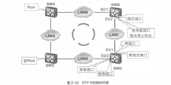 如下图所示,初始时候,SWA为根交换机,SWD的E0/2接口为备用接口,被逻辑阻塞。但网络变化,需要让SWC成为新的根交换机。经过重新选举,SWB的E0/2接口成为新的备用接口,而SWD的E0/2成为了新了根端口。如果Forward Delay为0,那么一旦SWD的E0/2接口被选举为新的根端口,将马上恢复数据转发的能力。而此时,SWB的E0/2接口不一定来得及进入Blocking状态,这时候网络中会出现临时环路。为了防止临时环路的出现,定义了Forward Delay,端口在被选举为根端口或者指定端口时,并不立即进入转发状态。