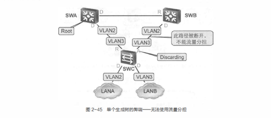 理想情况下,VLAN2和VLAN3使用不同的链路上行到相应的三层接口,可是 如果网络中只有一个生成树,swc和SWNSWB F斤形成的环路会被打开,例如,SWC连接到SWB的接口成为预备端口(Alternate Port) ,并处于Discarding状态,则VLAN2和VLAN3的数据都只能通过一条上行链路上行到SWA,不能实现流量分担。