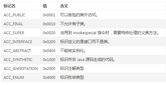 在常量池结束之后,紧接着的两个字节代表访问标志(access_flags),这个标志用于识别一些类或者接口层次的访问信息,包括:这个Class是类还是接口;是否定义为public类型;是否定义为abstract类型,如果是类的话,是否被声明为final等,具体的标志位以及标志的含义如下: