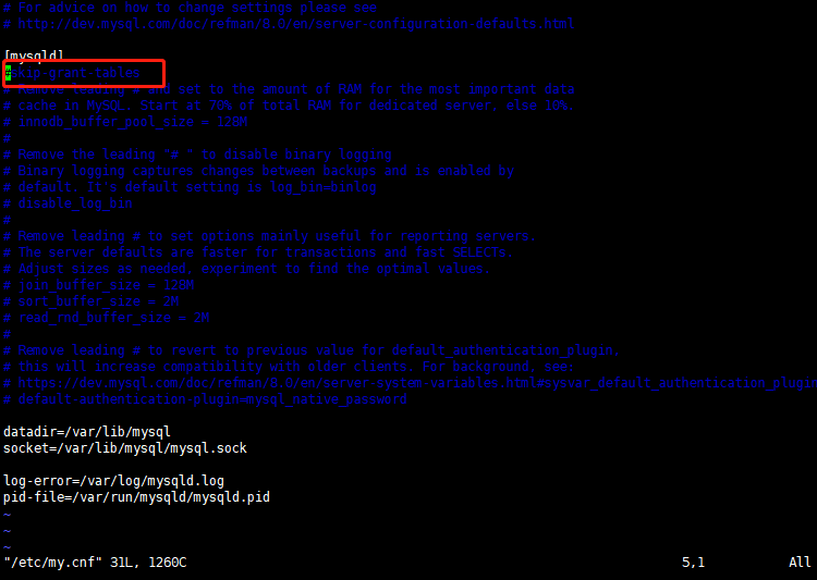 2 进入配置文件 vim /etc/my.cnf 添加代码 skip-grant-tables 即可跳过mysql密码验证进行登录