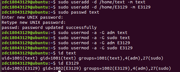 3)创建两个账号,一个账号为test,另外一个账号以大写E开头加上你自己学号尾数4位,两个账号分别设置密码及管理员权限,账号设置完成后,切换账号简单查看信息后,删除test账号,保留另一账号,以备后续操作。