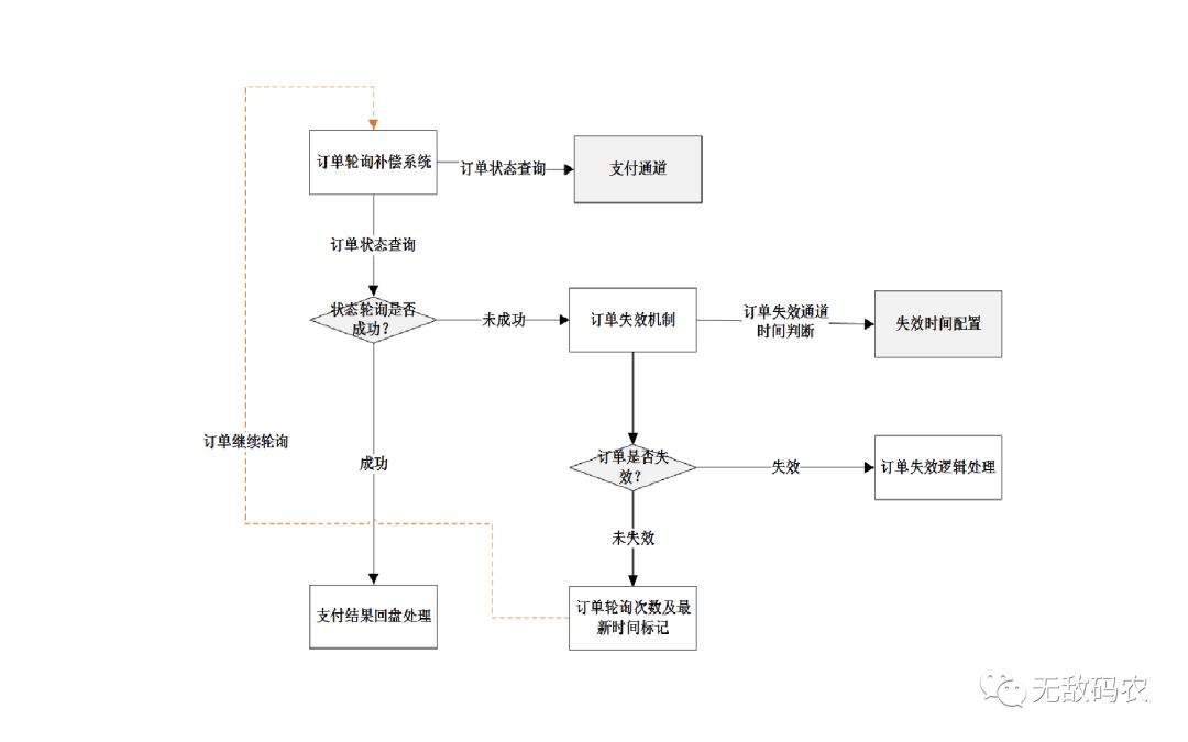 具体来说,就是支付流程按照正常的流程走,通过采用旁挂定时的方式扫描系统中一定时间策略范围内的pengding状态的订单,通过微信提供的订单查询接口主动轮询,一旦支付状态查询到终态即刻触发系统回调,完成支付订单及业务逻辑的补偿;