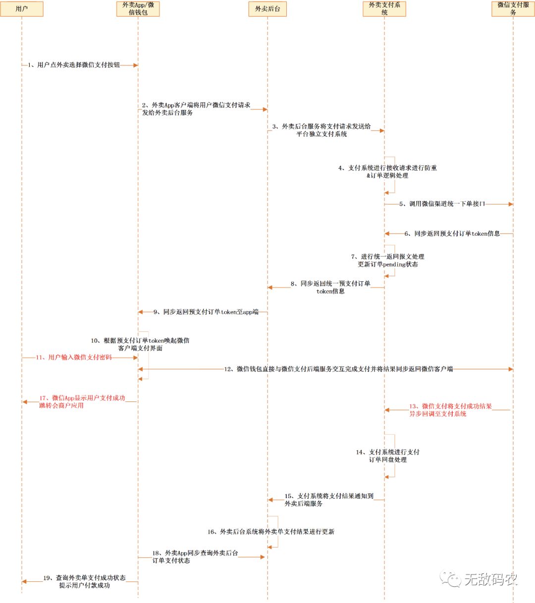 外卖App会根据预支付订单信息通过客户端支付SDK唤起微信支付客户端,由用户操作微信支付客户端直接向微信支付发起付款动作,需要注意的是,此时调用链已经转移到了站外,实际上此时用户是否支付或是否支付成功,无论是支付系统还是外卖系统及App本身都是无法直接感知到支付结果的,需要逐层回调;