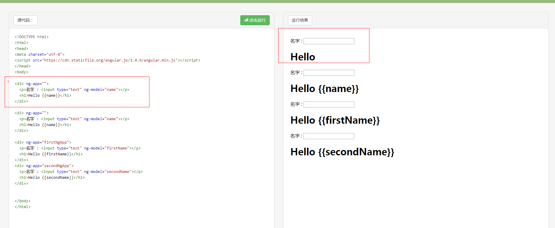 当代码片段为下列代码所示时,angular中的元素可以被正常编译;当是第2,3,4个代码块时,代码都不会被正常编译。