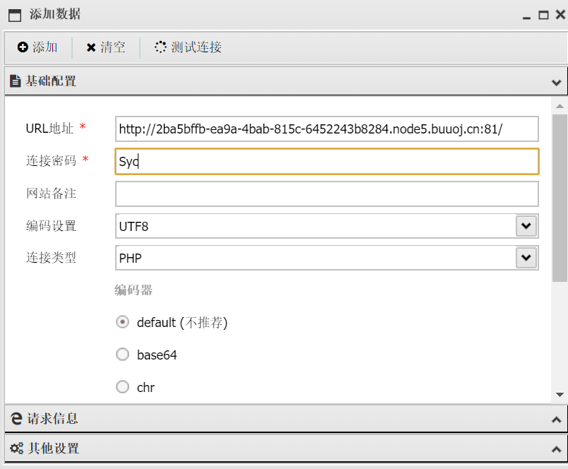 将网站URL输入进去,连接密码是Syc(题目提醒,从网页面post传参接受的变量)