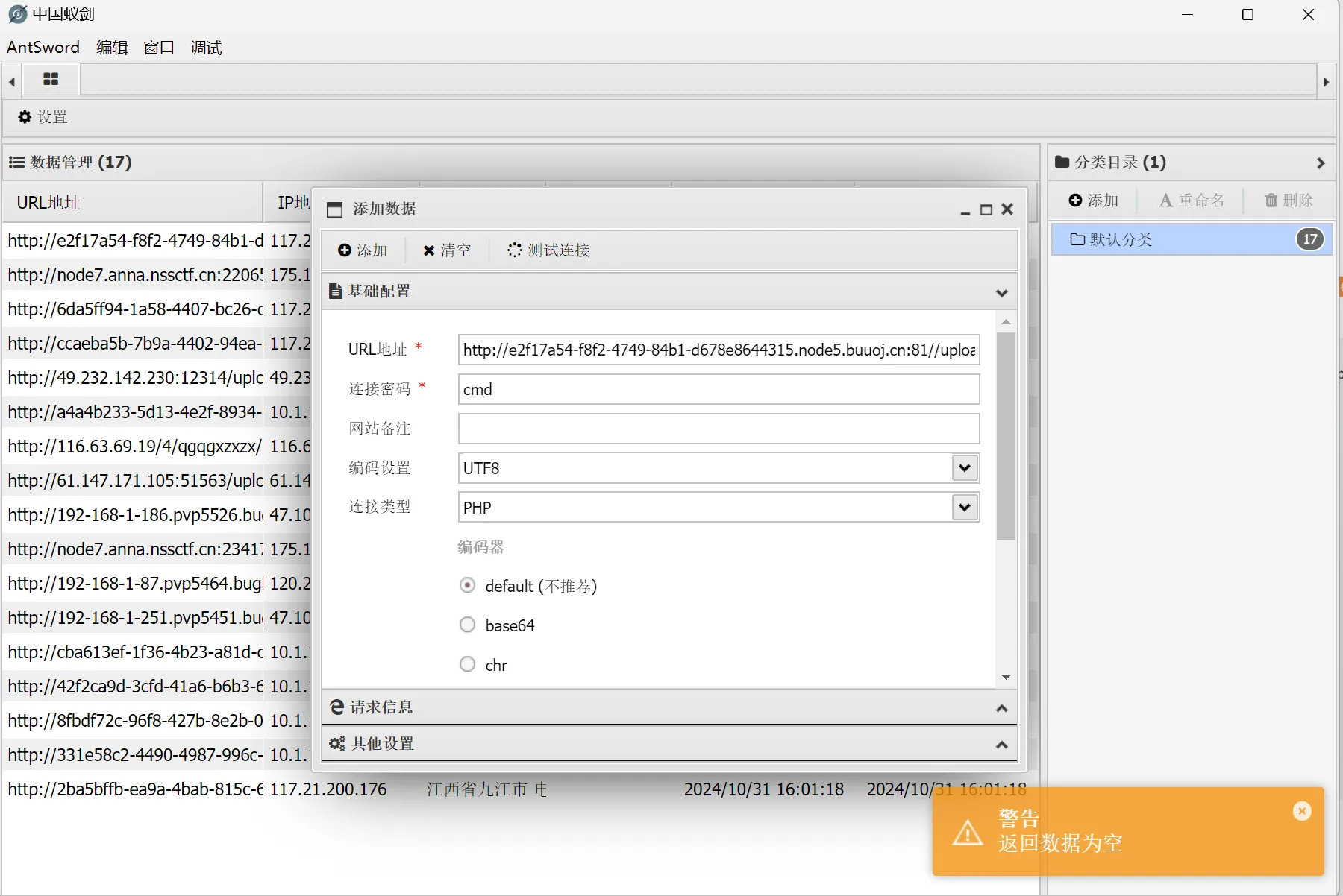 后面就是简单的连接蚁剑了,不做赘述
