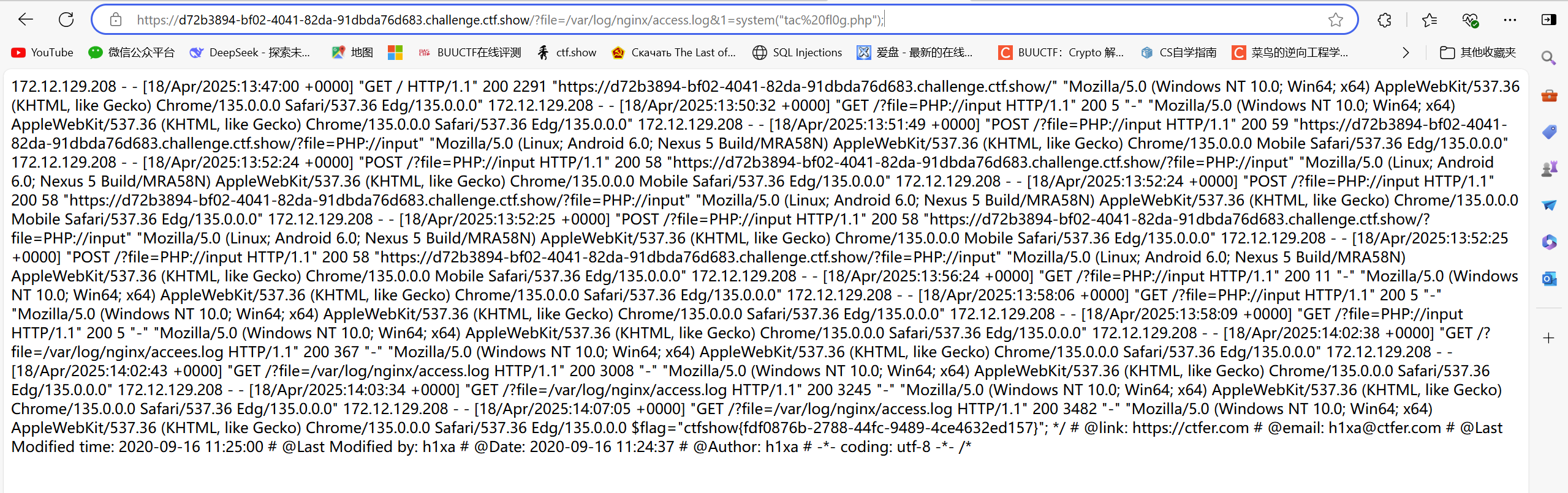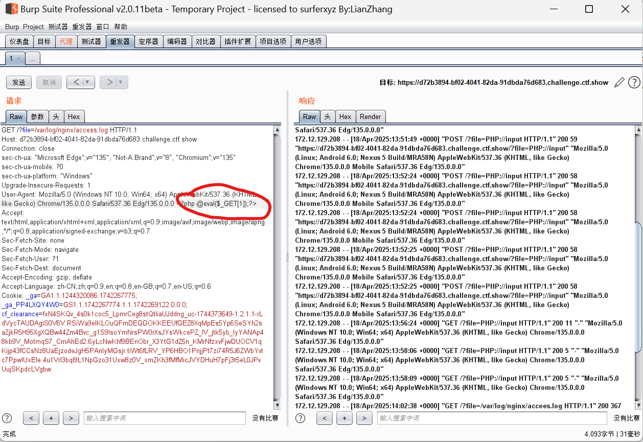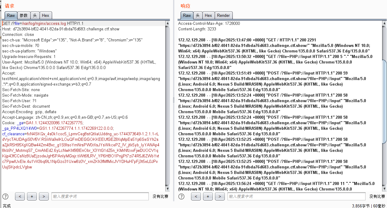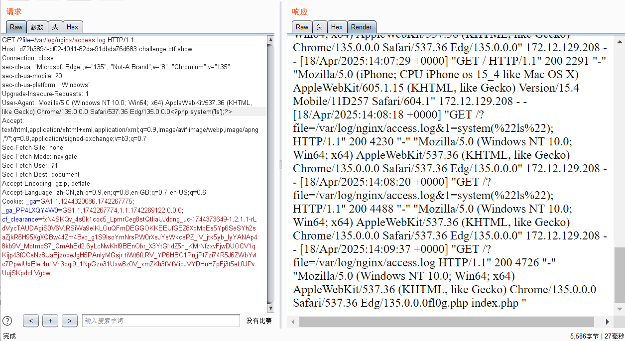 可以看出是nginx的服务器,那么我们就可以尝试日志文件包含,访问/var/log/nginx/access.log,可以发现每次UA头的内容都会写进日志,那么我们就可以考虑在UA头写马进去或者写敏感代码进去
