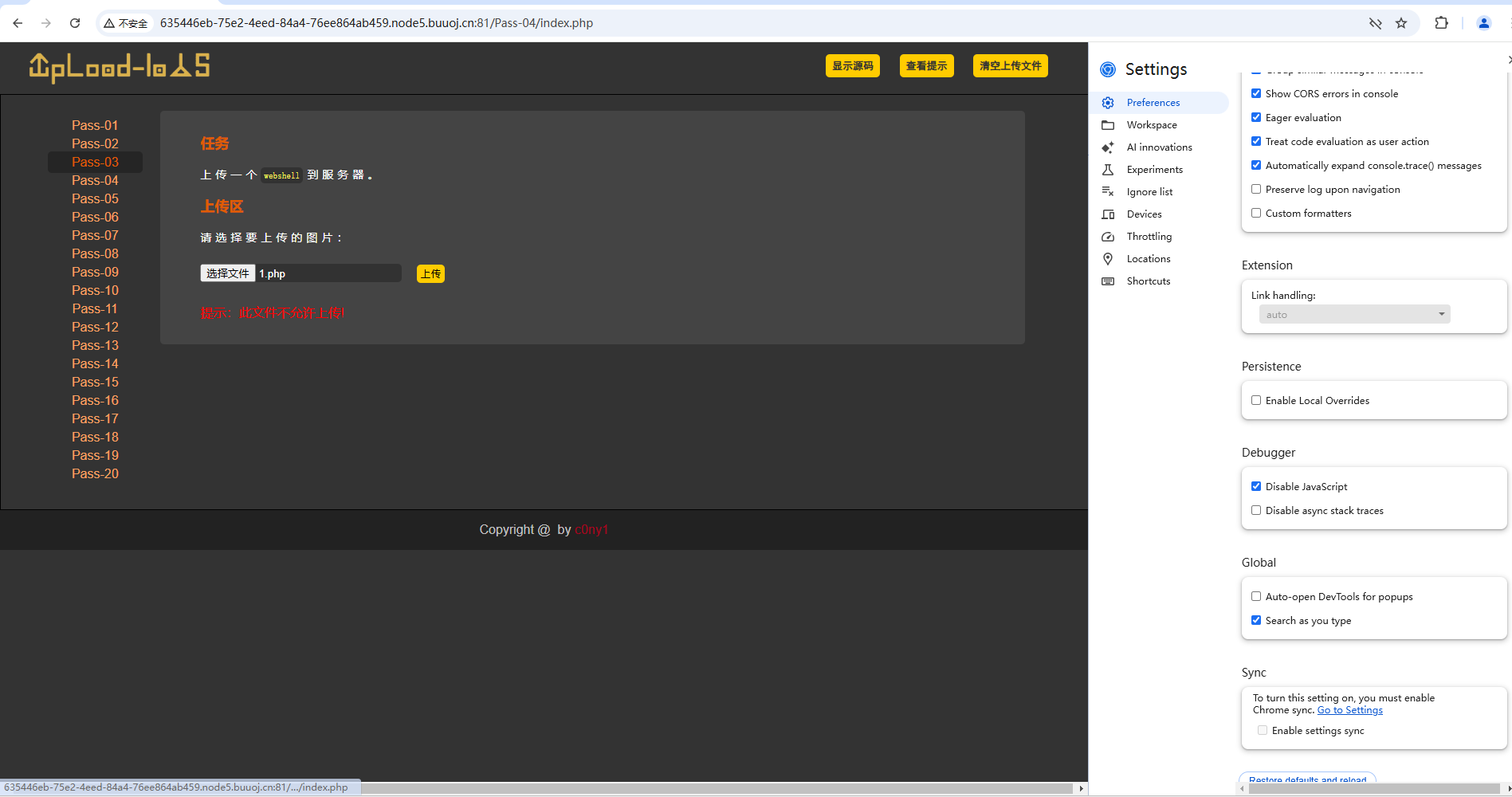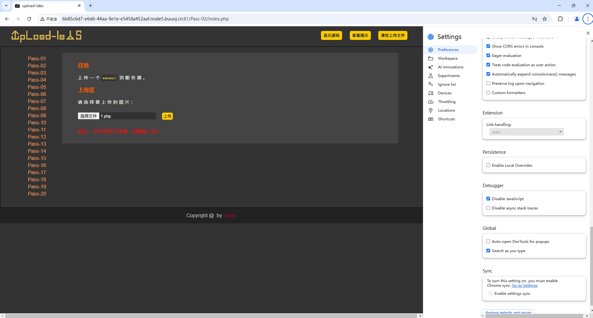 这次哪怕开启禁用JavaScript验证也不行,这次的验证不是简单的前段验证了,猜测是检测后缀,这时我们可以使用phtml文件