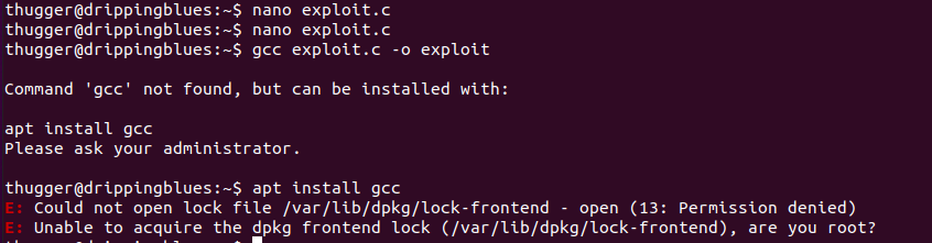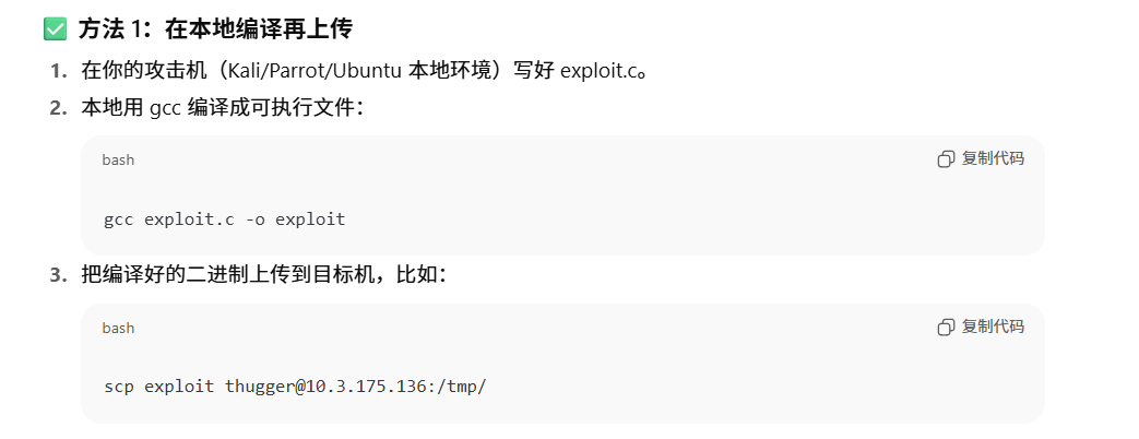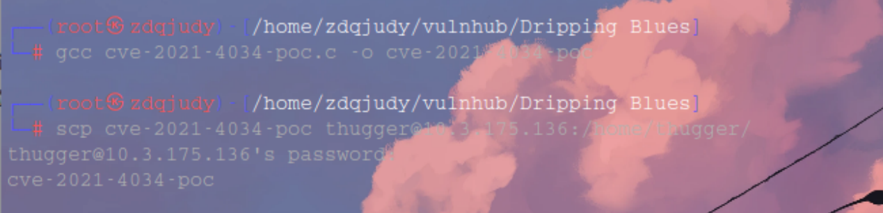 但是靶机上没有gcc,无法编译poc,所以只能在本地编译好再上传