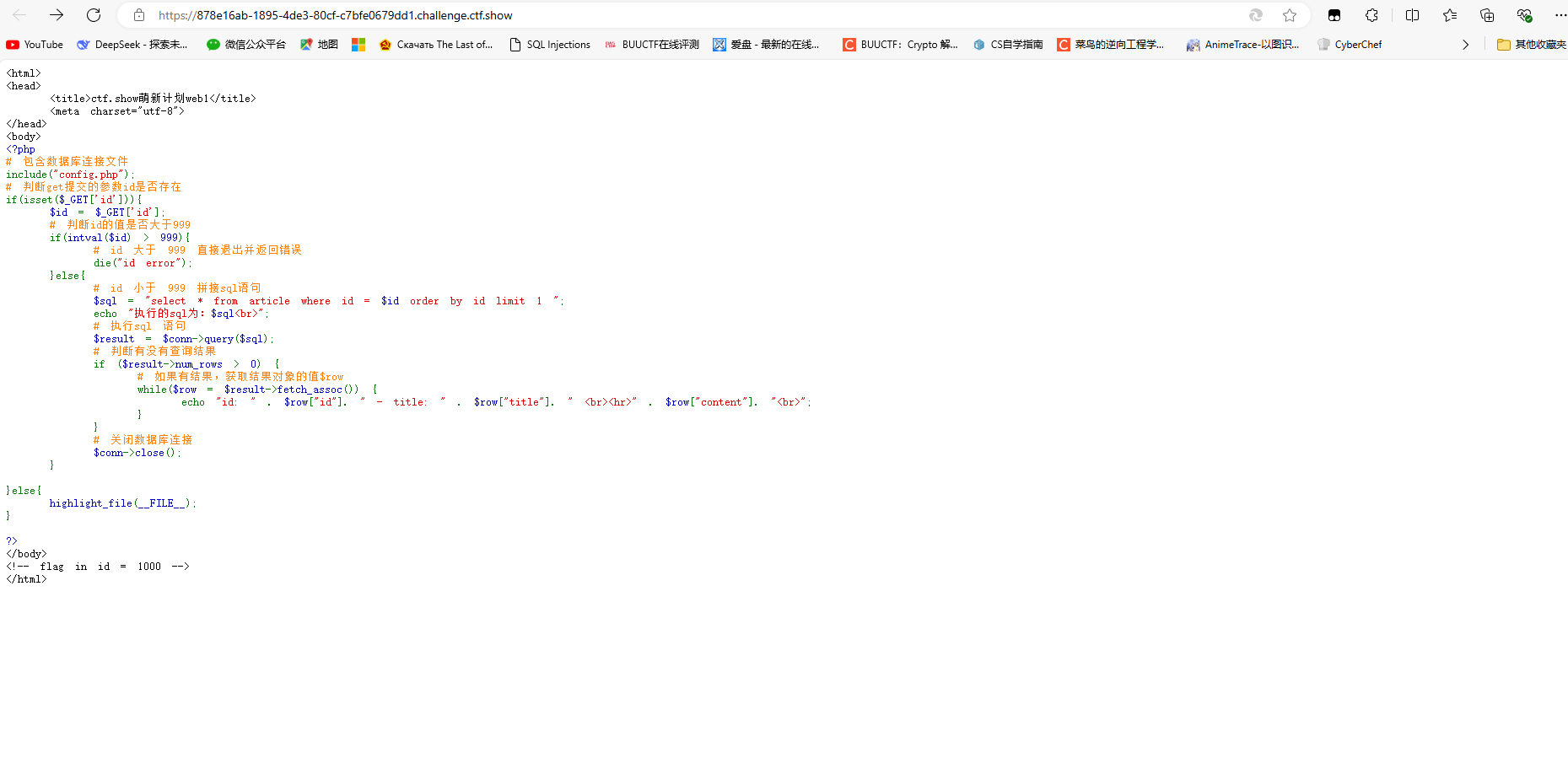 可以看到这道题是sql注入题目 ,通过get传参一个id的值,判断id值是否大于999,大于报错,小于就拼接sql语句