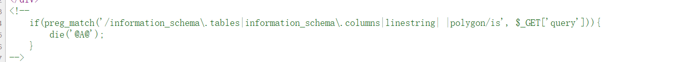 <font style="color:rgb(64, 64, 64);">information_schema.tables</font>- 过滤了对MySQL信息模式中tables表的引用<font style="color:rgb(64, 64, 64);">information_schema.columns</font>- 过滤了对MySQL信息模式中columns表的引用<font style="color:rgb(64, 64, 64);">linestring</font>- 过滤了MySQL的空间数据类型LINESTRING- (空格) - 过滤了空格字符