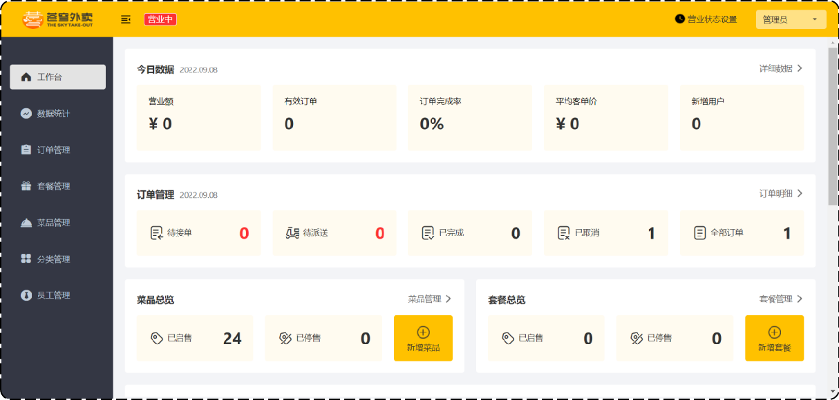 员工登录/退出 , 员工信息管理 , 分类管理 , 菜品管理 , 套餐管理 , 菜品口味管理 , 订单管理 ,数据统计,来单提醒。