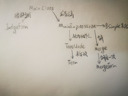 首先从MainClass类中读入表达式字符串,先用JudgeForm进行格式判断(JudgeForm里功能较多,现在想来应该将其根据具体的功能再细分),再用MainExpression类进行表达式处理,转为后续表达式,转为表达式树和求导运算(应该把这个类细分为多个小类分别执行不同的功能增大内聚性),在MainExpression类中进行树上求导时把每个树节点当作一个Treenode类,但其本质上是简单项Term类,其他类例如Simple类是再输出前进行结果化简,Merge类用来合并同类项。不足之处在于MainExpression中处理的事物太多,导致这个类的代码量大,结构冗杂,不易debug,应将其功能再细分给其他类