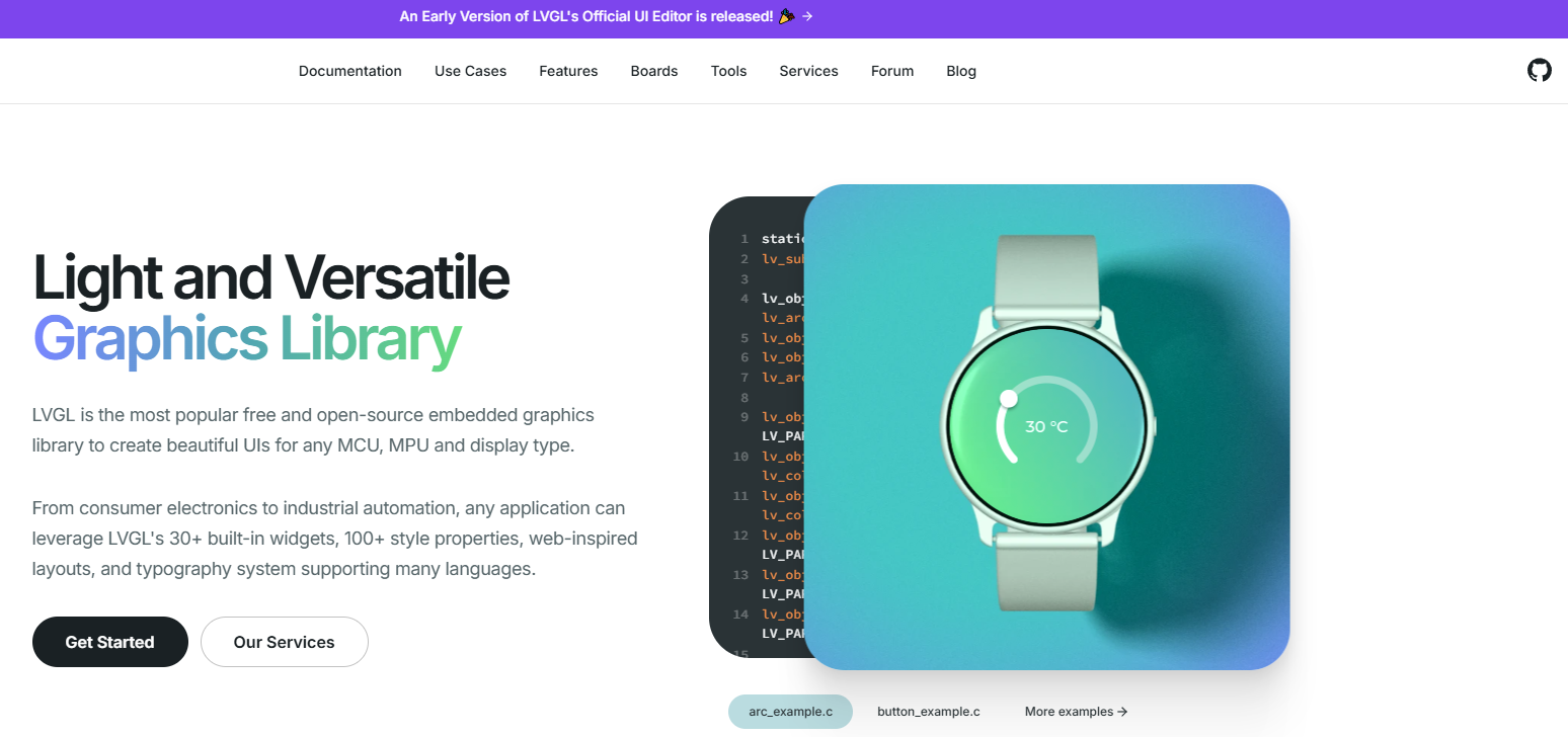 综上可知:LVGL是一款具有丰富部件,具备高级图形特性,支持多种输入设备和多国语言,独立于硬件之外的开源图形库。官方地址为:LVGL — Light and Versatile Embedded Graphics Library,该网页主要包含用户文档、图片转换器和字体转换器,该网页打开后如图1.1.1所示: