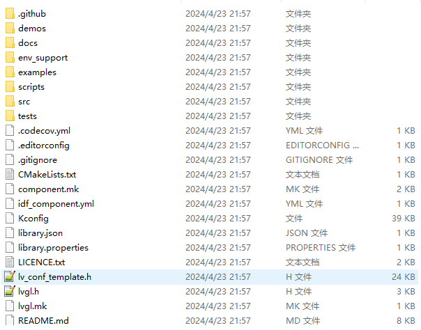 上图中,“LVGL使用工具.zip”压缩包里存放了 LVGL 相关的离线转换工具,这些离线工具是广大爱好者根据 LVGL 的字库定义规则和图片的处理特性而编写的软件;“lvgl-release-v8.2.zip”压缩包里存放了LVGL图形库的V8.2 版本源码,其解压后如图 1.1.3所示:
