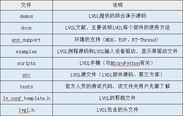 上表中的内容都是与移植相关的,具体的移植方法我们后面将详细介绍,目前大家只需要对LVGL源码的文件结构有一定的了解即可。