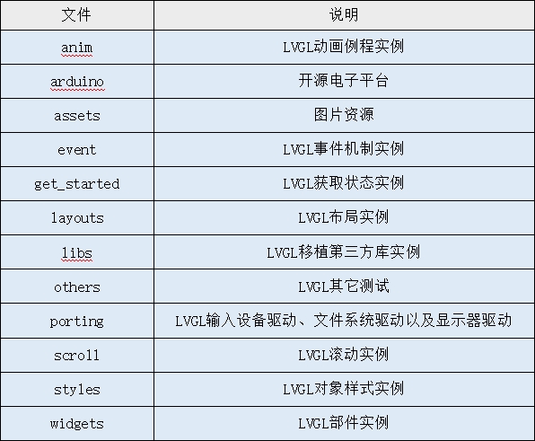 该文件夹主要包含LVGL部件实例、动画实例、其它第三方库实例以及输入设备和显示器驱动文件等内容,具体如表 1.1.2所示: