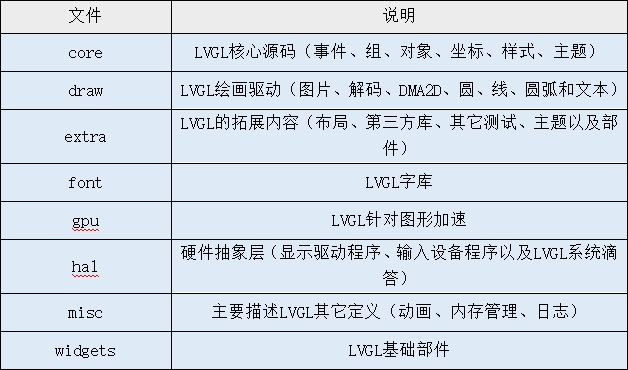 该文件夹主要包含LVGL源文件(部件源码、多种解码库),具体如表 1.1.3所示: