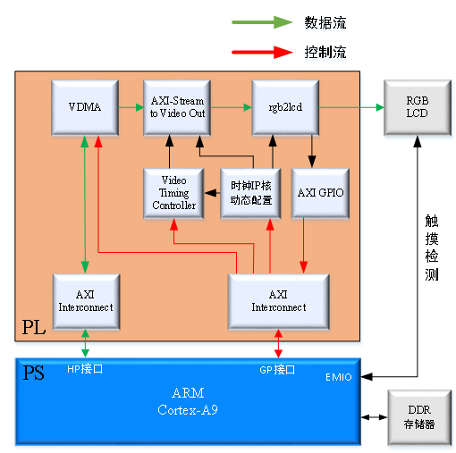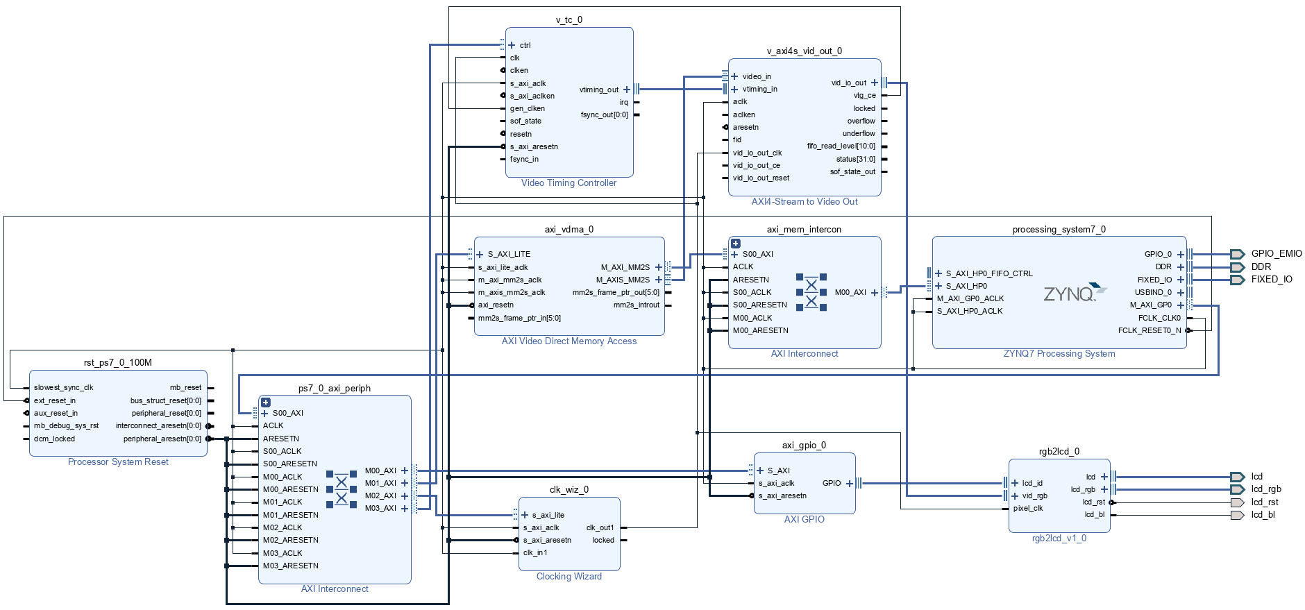由上图可知,首先我们需要在PS端写彩条数据到DDR中,然后PS需要通过AXI Interconnect IP核与AXI_HP端口进行连接,用于VDMA IP和PS之间高速传输数据。VDMA IP核将DDR3中的视频或图像数据传输给AXI4-Stream to Video Out IP核,AXI4-Stream to Video Out IP核在VTC IP核的控制下,把AXI4-Stream格式的数据转换成视频输出的数据格式(如RGB888),并将输出的视频数据流连接至RGB2LCD IP核(rgb2lcd)的输入端。最后PS通过AXI GPIO IP核获取LCD屏ID,并根据获取到的ID配置VDMA IP核的帧缓存空间大小、读通道等以及配置VTC IP核的输出的时序参数。由于不同分辨率的LCD屏其驱动时钟不一样,因此本次实验需要将时钟配置成动态时钟,PS根据LCD屏的ID配置时钟IP输出不同的时钟。再通过加入EMIO来检测LCD屏触摸状态的功能,这一部分功能是由PS端来实现的。PS不断地扫描LCD的触摸状态,包括是否有触摸动作发生、当前触摸点的坐标等信息,根据扫描到的信息来决定是否向VDMA的Frame Buffer中写入数据以及向Frame Buffer的哪个地址写入数据等等。然后位于PL端的VDMA读取逻辑不断地将Frame Buffer中存储的数据送给LCD进行显示。