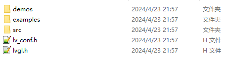 我们将上述图 1.1.3获得的LVGL源码进行裁剪并将lv_conf_template.h文件改名为lv_conf.h。除了examples文件夹、src文件夹、lv_conf.h和lvgl.h文件,其它文件和文件夹均与移植无关,我们可以将它们删除,这样可以得到精简的LVGL源码。修改后的LVGL源码(保留了demos文件夹)如图 1.4.2所示: