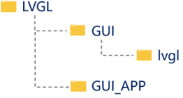 我们在工程目录下新建一个LVGL文件夹,并在该文件夹下面新建GUI文件夹以及GUI_APP文件夹,最后在GUI文件夹下新建lvgl文件夹。具体的文件夹结构如图 1.4.4所示: