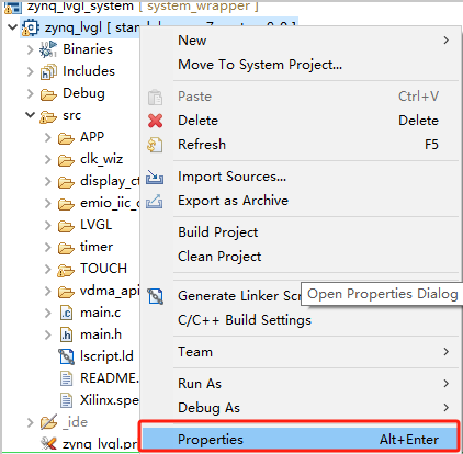 添加LVGL源码的文件夹路径,包含源码文件,右键选择应用工程,选择Properties选项,如下图所示: