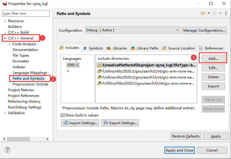 在打开的Properties选项卡中选择C/C++ General选项下的Paths and Symbols,Add添加头文件路径,如下图所示: