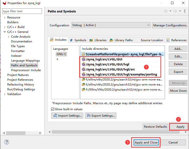 将所有头文件添加完成之后,点击Apply应用之后点击Apply and Close,确认并关闭选项卡,移植LVGL只需要添加关键的头文件路径即可,因为lvgl.h文件已经为我们省去了很多包含头文件的操作,添加的头文件路径如下图所示: