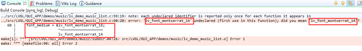 打开lv_conf.h文件,找到LV_USE_DEMO_MUSIC宏定义并设置为1,开启该实验,并且修改颜色深度配置LV_COLOR_DEPTH宏定义为32,编译工程,若出现下图所示报错,这说明14号以及16号字体没有定义。