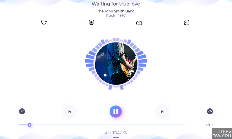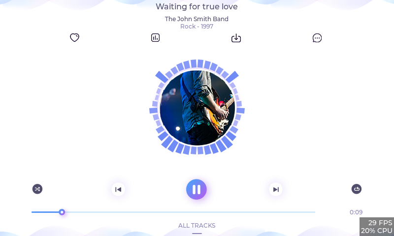 编译工程并下载到开发板中。值得注意的是,这个官方例程仅支持 800*480 分辨率的屏幕,如果使用其他分辨率的屏幕,可能导致例程功能无法正常展现。音乐播放器例程正常运行的界面如下图所示: