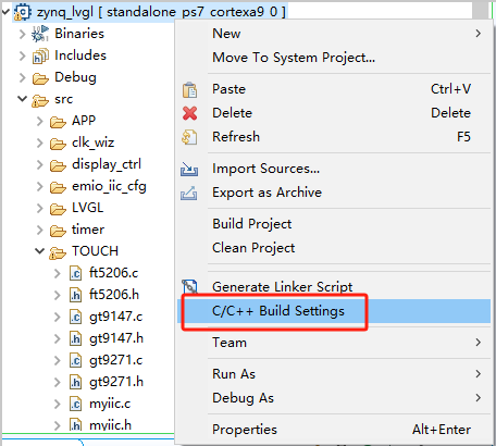 右键应用工程选择C/C++ Build Settings选项,如下图所示: