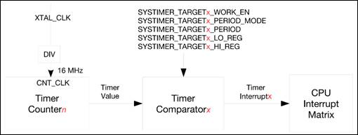 COMP0、COMP1、COMP2均为ESP32-S3系统定时器内置的52位比较器。比较器同样使用XTAL_CLK作为时钟源(40MHz)。