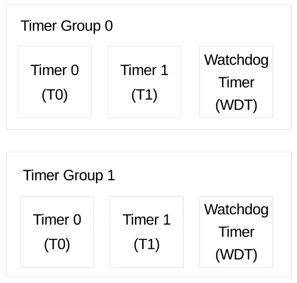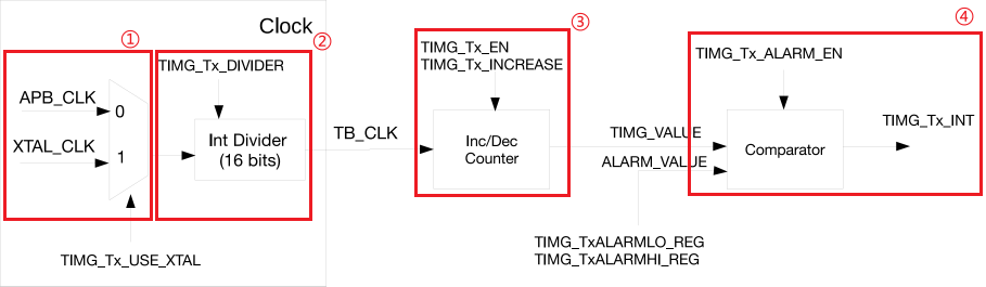 每个定时器可通过配置寄存器TIMG_TxCONFIG_REG的TIMG_Tx_USE_XTAL字段,选择APB时钟(APB_CLK)或外部时钟(XTAL_CLK)作为时钟源。