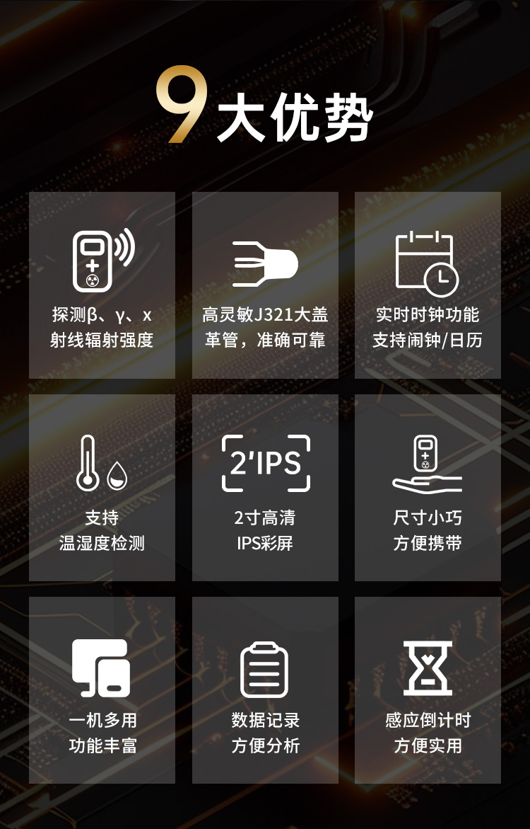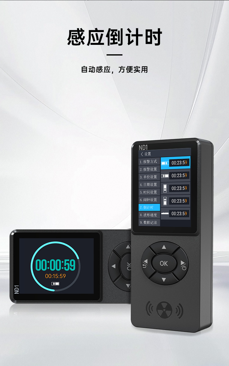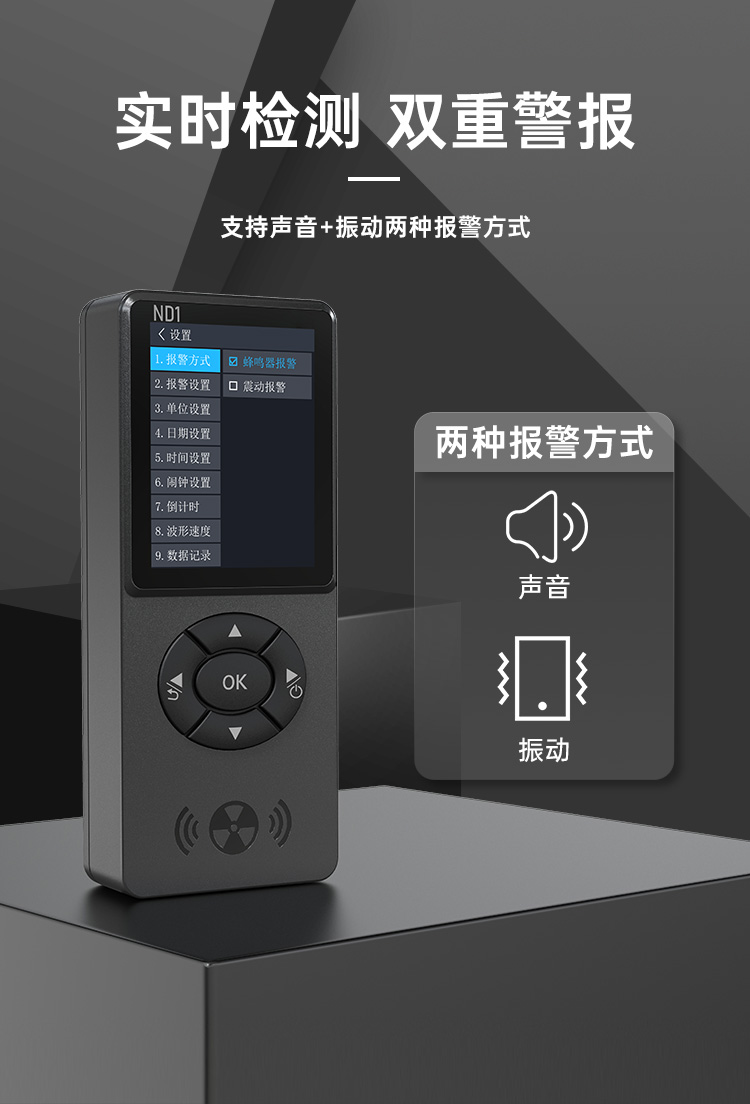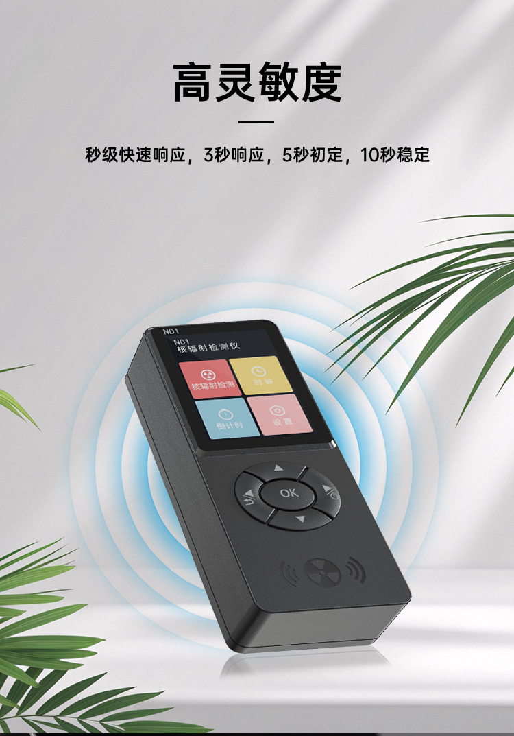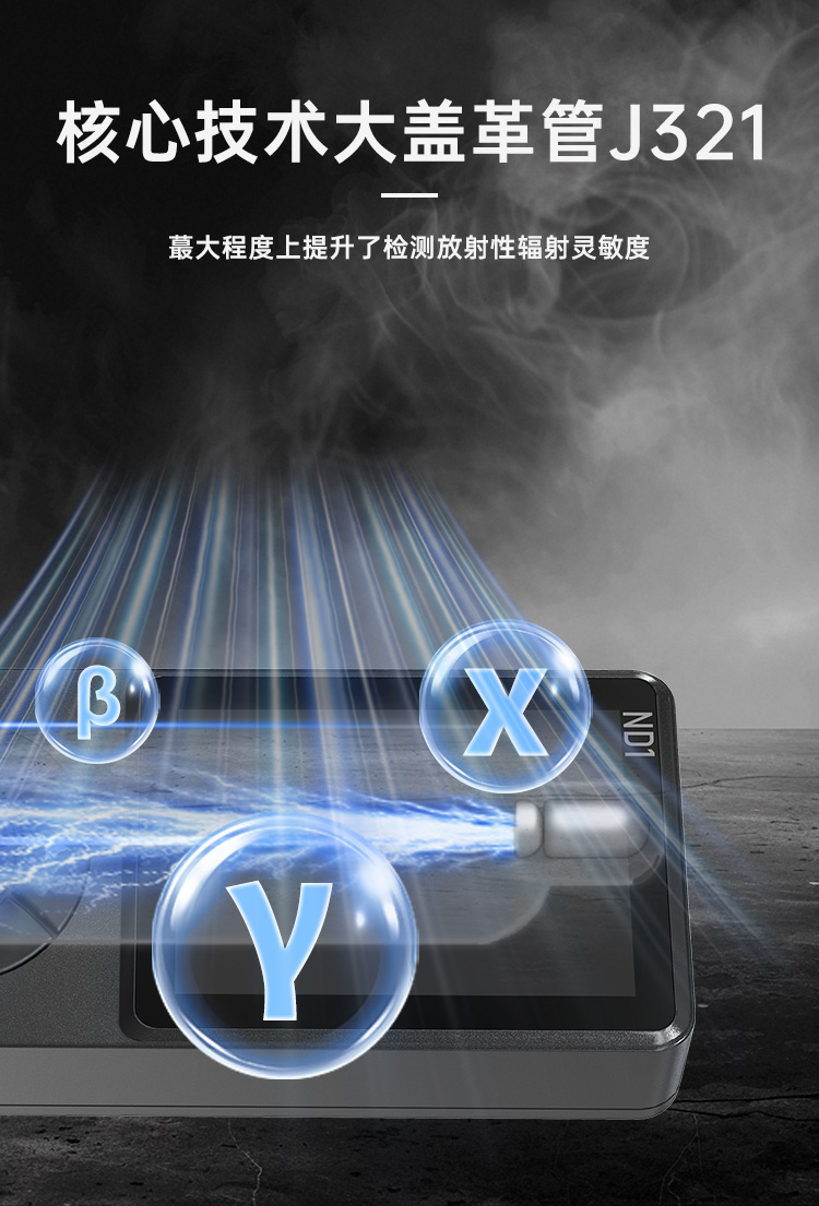 适用范围广,功能丰富,一机多用,可玩性高;深圳计量院校准证书,权威机构检测认证;高灵敏J321大盖革管,准确可靠;ND1支持约100万个辐射值记录,U盘数据导出,方便分析;支持手持感应功能,方便好用;报警方式与阈值可调,不错过危险警告;支持倒计时功能,3D感应,方便使用。