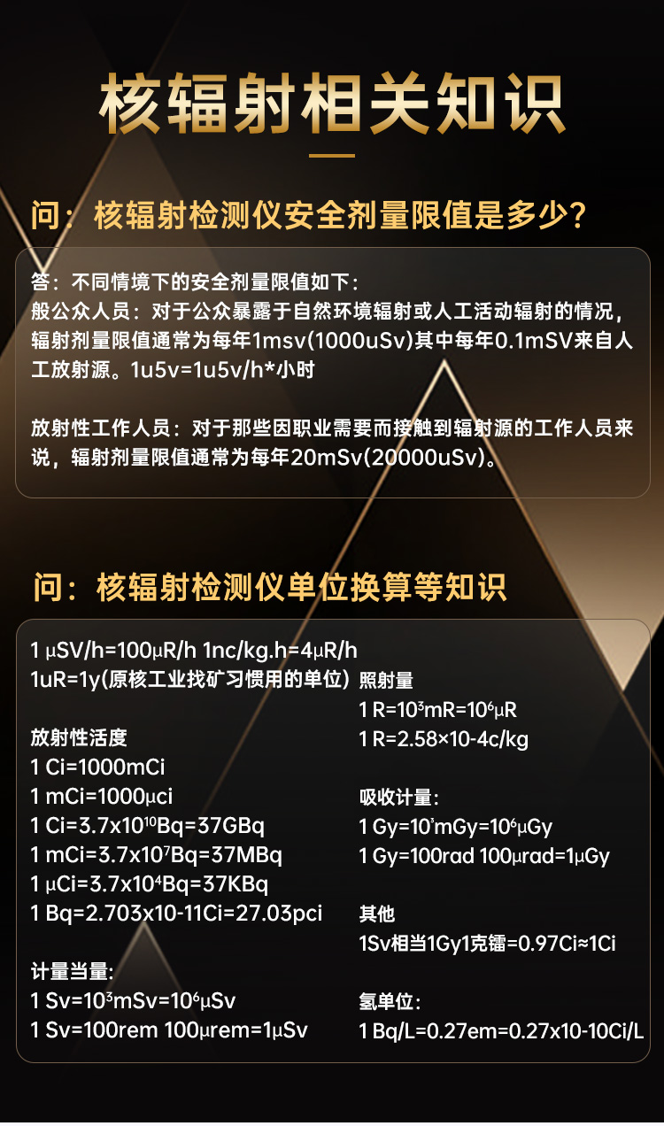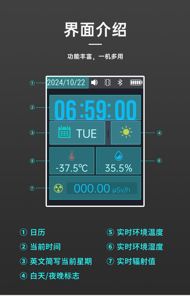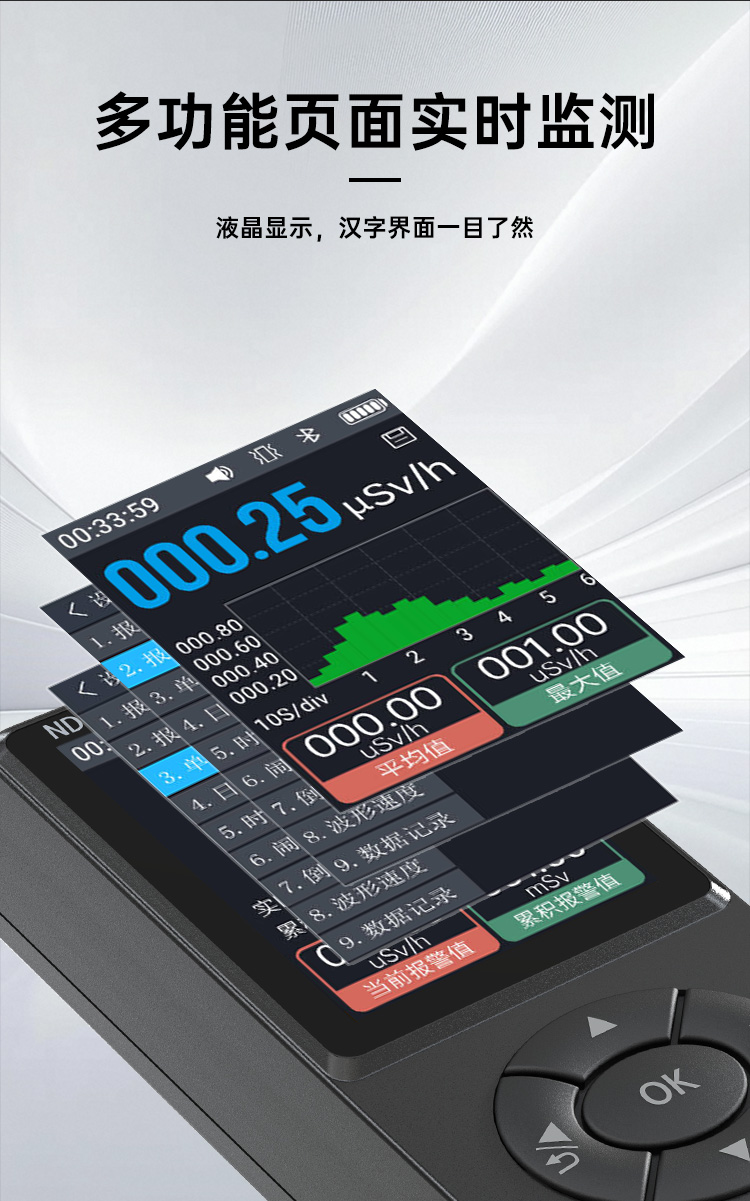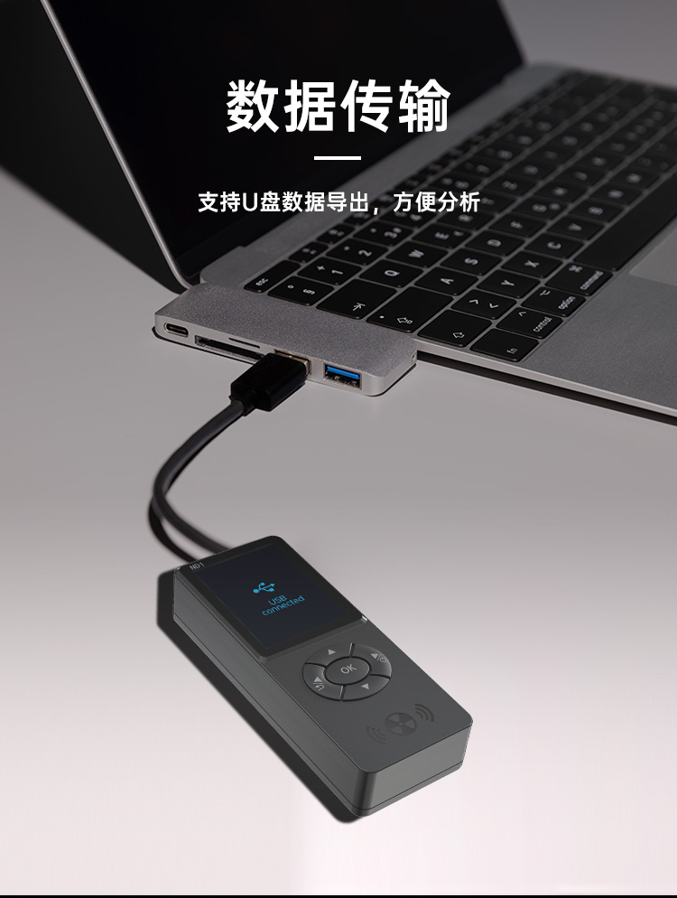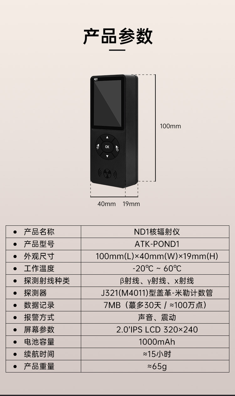 适用范围广,功能丰富,一机多用,可玩性高;深圳计量院校准证书,权威机构检测认证;高灵敏J321大盖革管,准确可靠;ND1支持约100万个辐射值记录,U盘数据导出,方便分析;支持手持感应功能,方便好用;报警方式与阈值可调,不错过危险警告;支持倒计时功能,3D感应,方便使用。