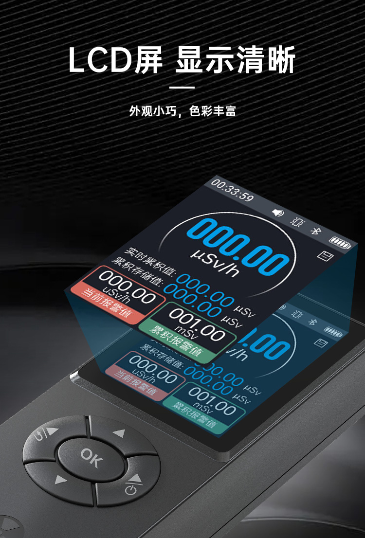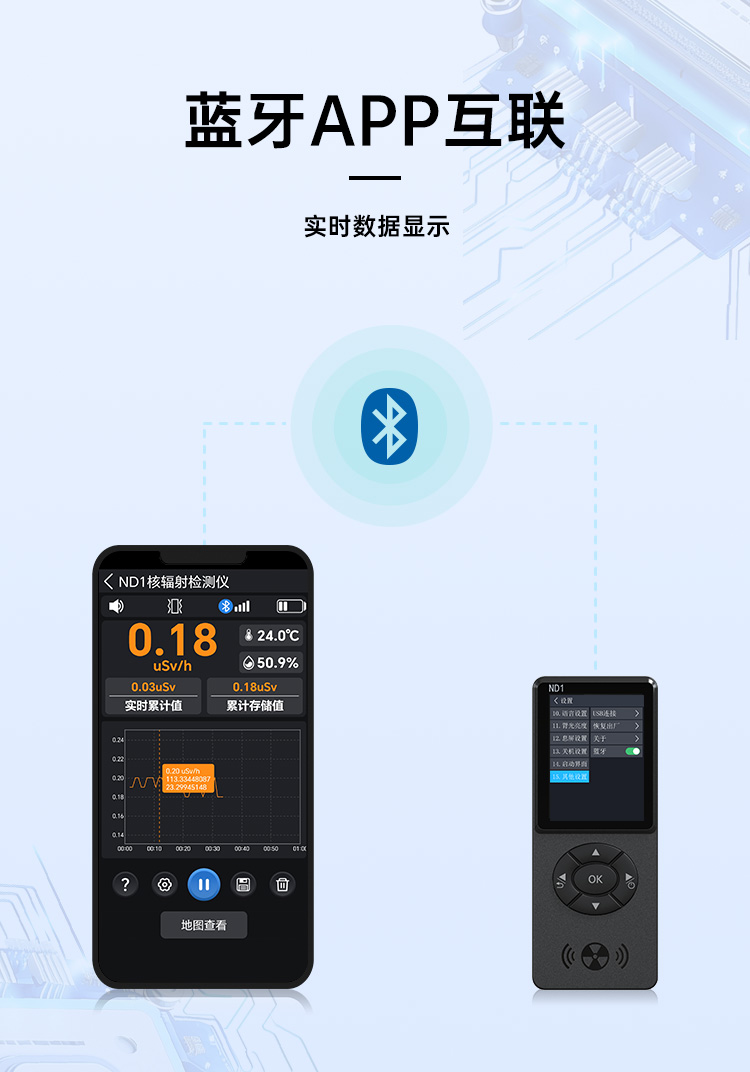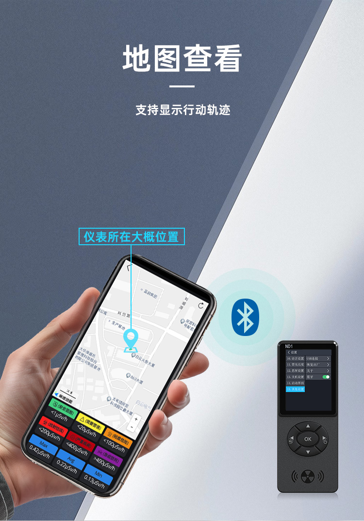 支持蓝牙APP数据互联,实时数据显示,支持参数设置,时间同步到仪器;支持地图查看功能,实时显示行动轨迹,轨迹颜色随辐射值量级提高而变色,直观明了;地图数据可回查,了解经过区域的辐射值变化,方便规避危险区域。