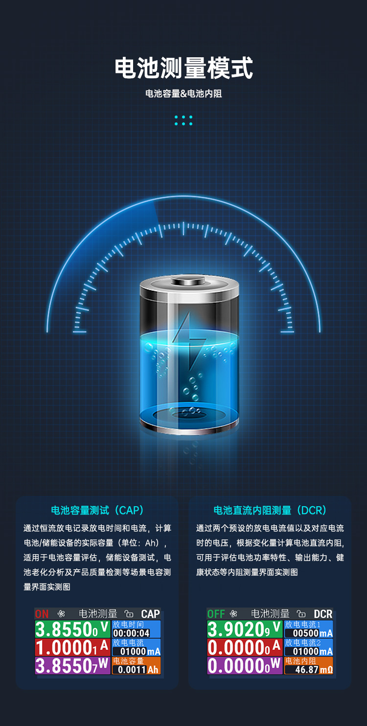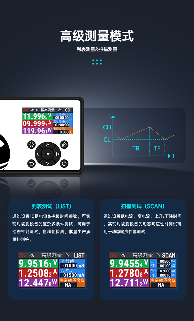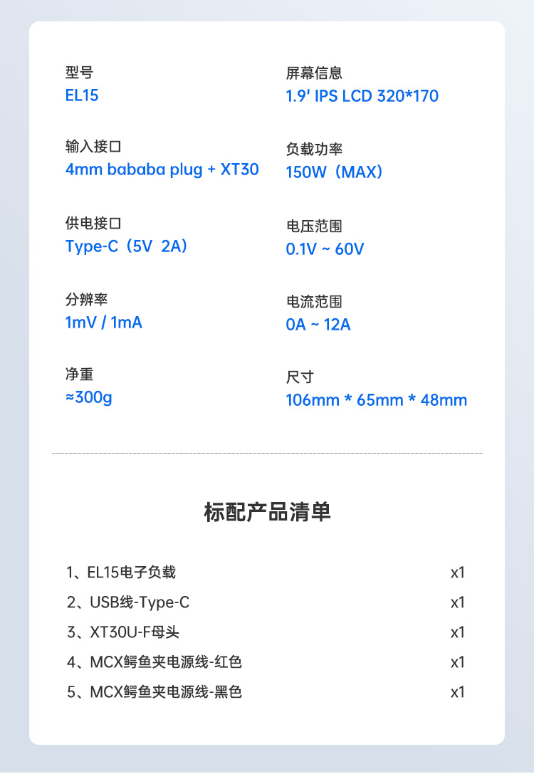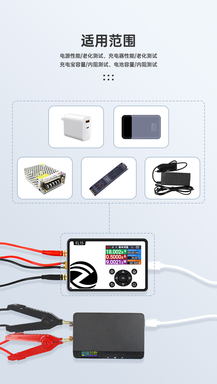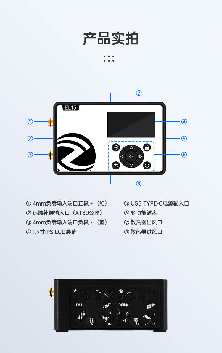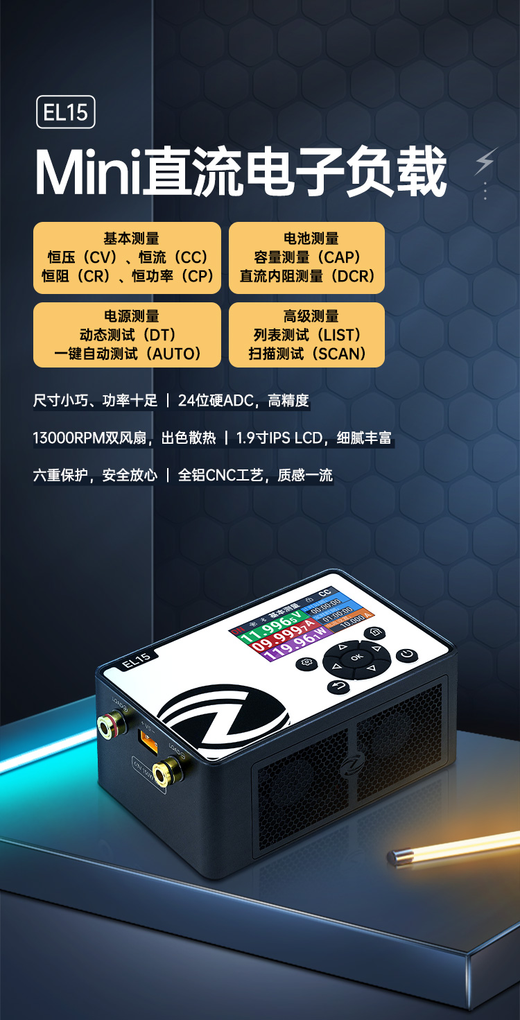 EL15电子负载功率高达150W;0.160V宽电压范围,012A大电流输出,性能强劲!支持电池容量测试、内阻测试、电源动态测试、自动测试、列表测试、扫描测试等多种专业功能,一机满足多样化测试需求!远端补偿输入,消除线损误差,数据精准可靠!六重保护电路设计,安全稳定!智能温控风扇系统,在高效散热与低噪运行间取得完美平衡!