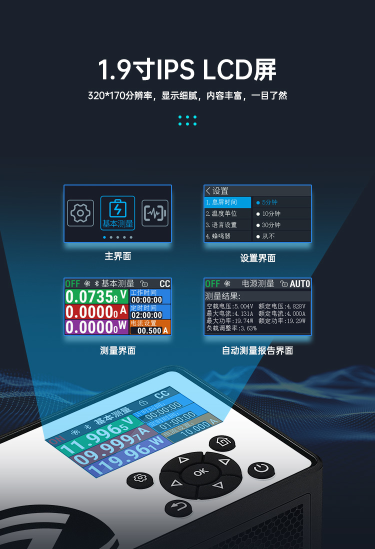 不仅功能专业,同时也非常智能!一键快速测试,操作简单高效!负载输入口彩灯功率提示,状态直观可见!全铝CNC外壳,质感一流,更支持固件升级,持续优化体验!
