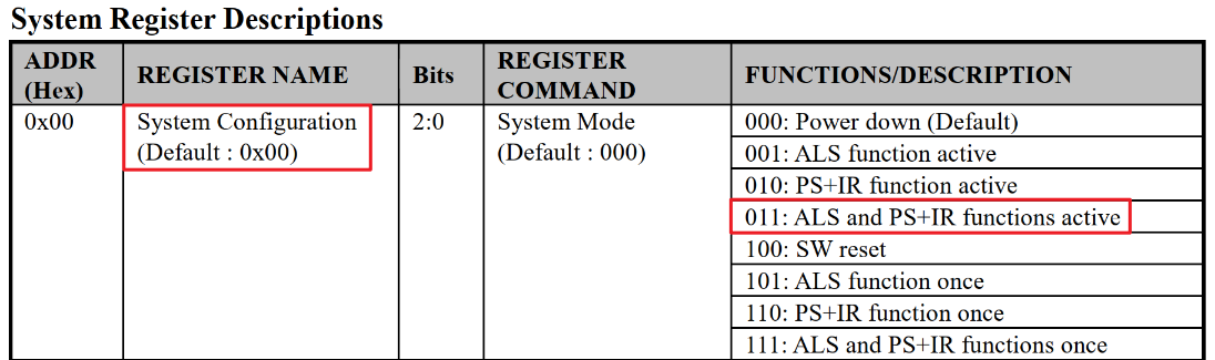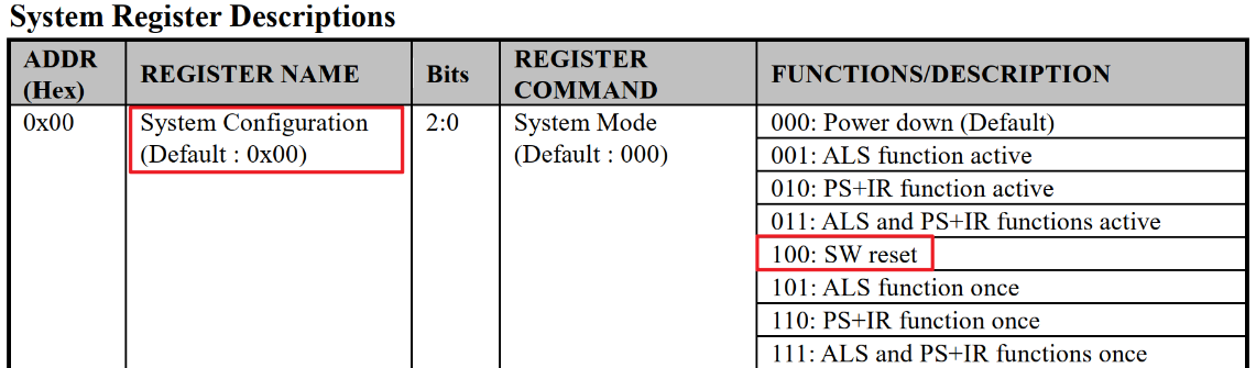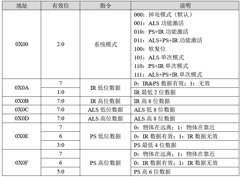 上表中,0X00是一个系统模式控制寄存器,主要在初始化的时候配置,初始化的时候,我们先设置其值为100,实行一次软复位,随后设置其值为011,开启ALS+PS+IR检测功能。