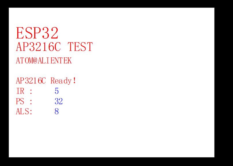 开机的时候先检测AP3216C是否存在,如检测不到AP3216C,则在LCD屏上面显示报错信息。如果检测到AP3216C,则显示正常,并在主循环里面,循环读取ALS+PS+IR的传感器数据,并显示在LCD屏幕上面。