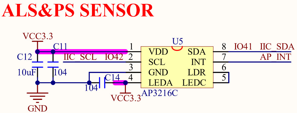 AP3216C和主控芯片只需要连接SCL、SDA和INT,就可以实现驱动。其SCL和SDA同24C02、XL9555共用,连接在IO41和IO42上,INT脚连接在XL9555的P0_0上。